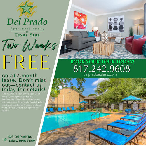 Let us be your escape from the hustle and bustle of Downtown Dallas or Fort Worth and relax in charming Euless, Texas! Our unbeatable location provides you with easy access to Interstates 183 and 121, local parks, concert venues and so much more. We are also close to the best dining, shopping and entertainment options Euless has to offer. No matter how you spend your days or your nights, Del Prado at Texas Star will always be happy to welcome you home. Contact us today to schedule a tour of our beautiful apartment community!